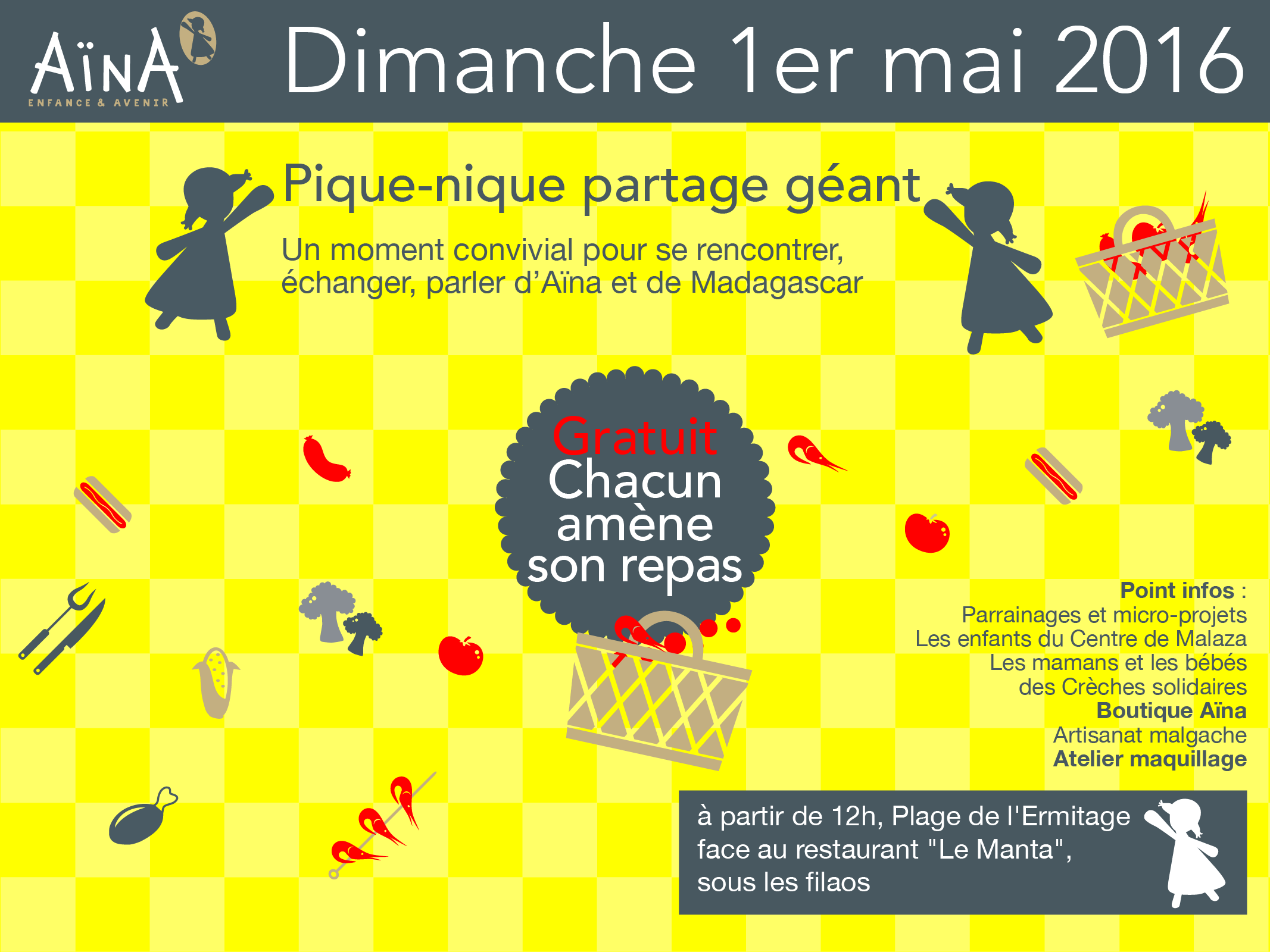 L’association Aïna, Enfance & Avenir a le plaisir d’inviter ses adhérents mais aussi toutes les personnes intéressées par nos actions à se réunir pour un moment de partage et de convivialité, lors d’un pique-nique humanitaire qui aura lieu sur la plage de l’Ermitage, à l’ombre des filaos. Ce rdv annuel est l’occasion de partager, autour d’un repas « tiré du panier », les expériences des uns et des autres : adhérents, parrains, bénévoles, nouveaux venus…. Cet événement est ouvert à tous !