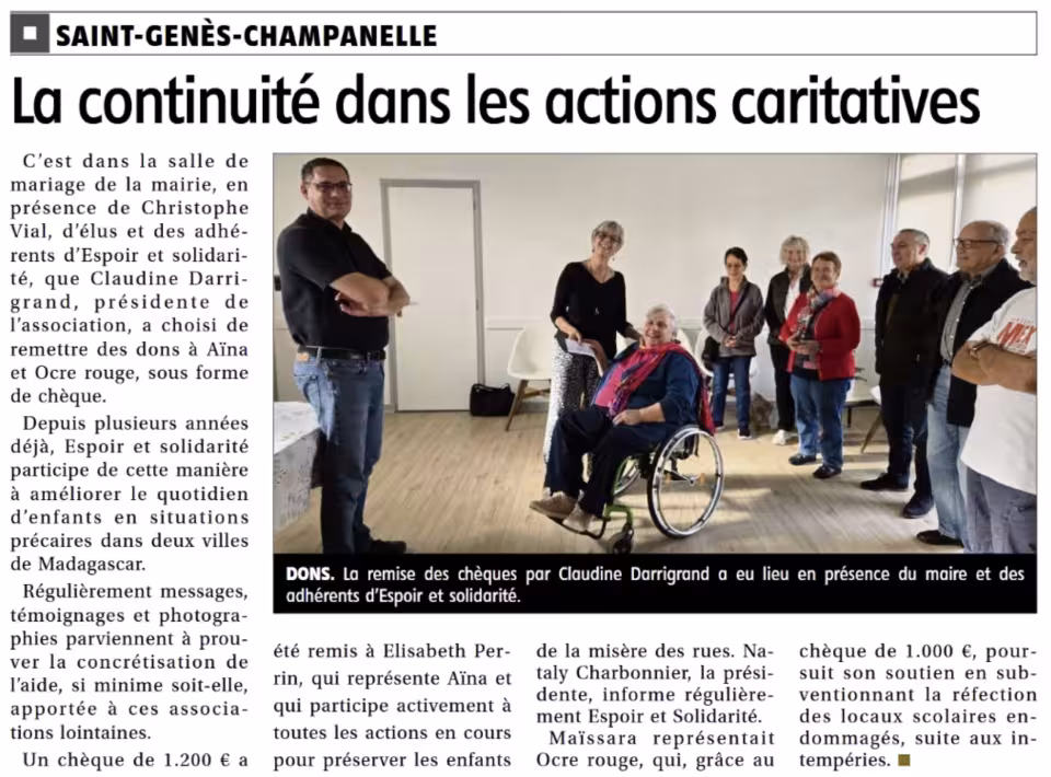 Le 15 septembre, dans la salle des mariages de la mairie, entourée d’élus et d’adhérents, Claudine Darrigrand, présidente d’Espoir et Solidarité, a remis un chèque de 1 200 € destiné à Aïna. Ce geste, transmis par Élisabeth Perrin, fidèle représentante d’Aïna dans le Puy-de-Dôme, incarne bien plus qu’une aide matérielle : il est un signe de confiance, de continuité et d’engagement partagé.